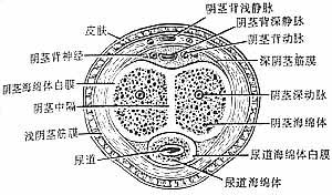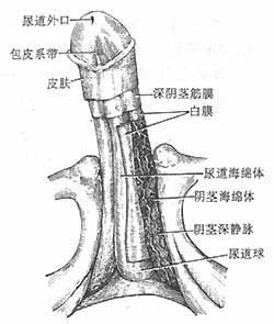 3、深陰莖筋膜deep fascia of penis或稱Buck筋膜,共同包裹陰莖的三條海綿體。其前端于陰莖的冠狀溝附近逐漸變薄消失,后端至陰莖根部上續腹白線,在恥骨聯合前面有彈性纖維參與形成陰莖懸韌帶。該筋膜的深面于陰莖背側中線上,有一條陰莖背深靜脈穿行,此靜脈的兩側各有一條深部施行陰莖背神經的阻滯麻醉。