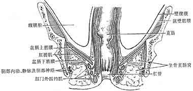 1、位置與組成 坐骨直腸窩ischiorectal fossa位于肛管兩側(cè),略似尖朝上方,底向下的錐形腔隙(圖2)。其內(nèi)側(cè)壁的下部為肛門外括約肌,上部為肛提肌、尾骨肌及覆蓋它們的盆膈下筋膜;外側(cè)壁的下部為坐骨結節(jié)內(nèi)側(cè)面,上部為閉孔內(nèi)肌、閉孔筋膜及深會陰筋膜;前壁為會陰淺橫肌及尿生殖膈;后壁為臀大肌下緣及共筋膜和深部的骶結節(jié)韌帶。窩尖由盆膈下筋膜與閉孔筋膜匯合而成,窩底為肛門兩則的淺筋膜及皮膚。坐骨直腸窩向前延伸至肛的是肌與尿生殖膈之間,形成前隱窩;向后延伸至臀大肌、骶結節(jié)韌帶及與尾骨肌之間,形成后隱窩。坐骨直腸窩內(nèi)除血管、淋巴管、淋巴結及神經(jīng)外,尚有大量的脂肪組織,稱坐骨直腸窩脂體。排便時利于肛管擴張,并具有彈性墊的作用。窩內(nèi)脂肪的血供欠佳,又鄰直腸和肛管,是污染較多的部位,感染時容易形成膿腫或瘺管。